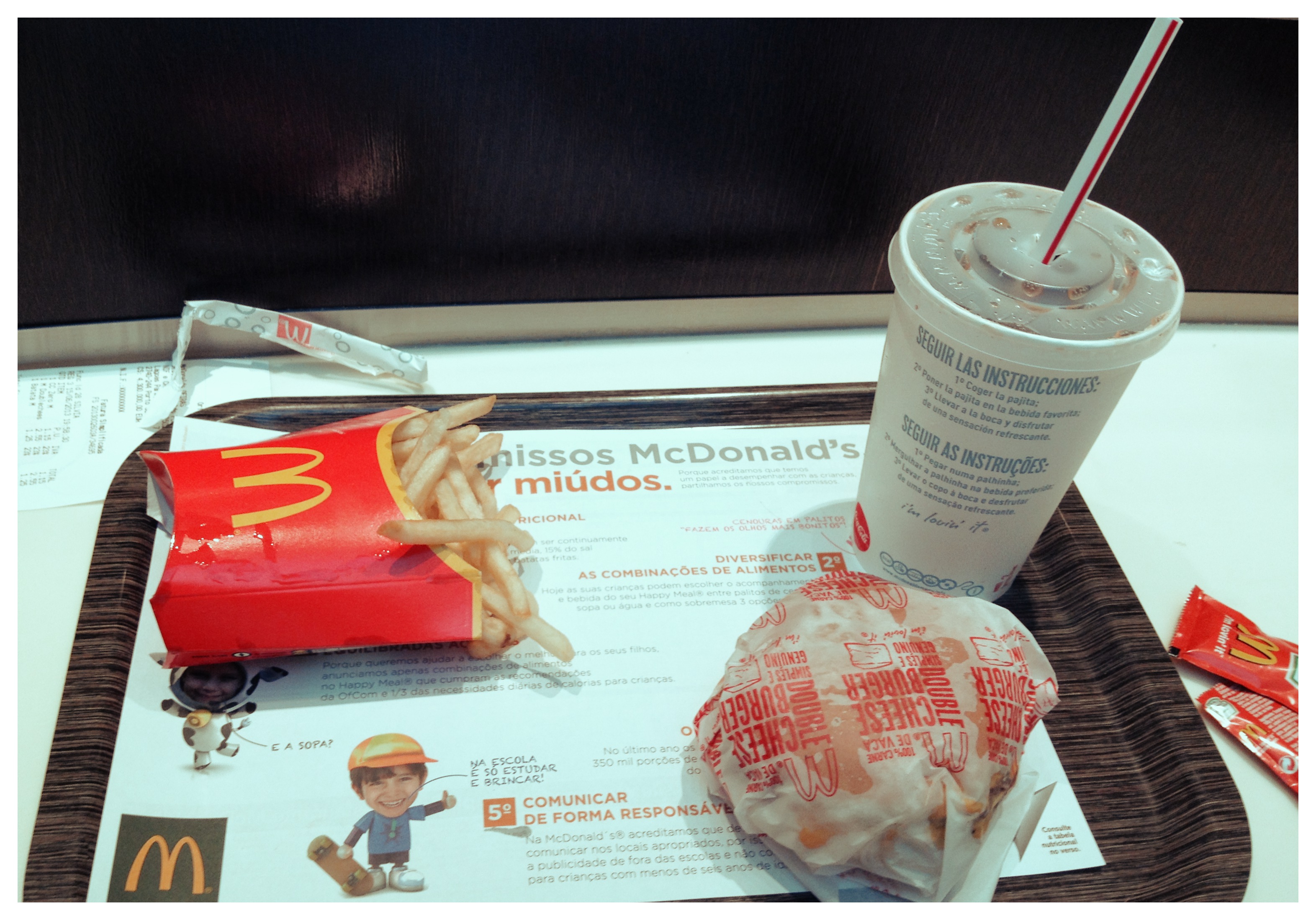 Combinado o sítio e a hora para a passagem de testemunho, que estava na pose do João Prisal, lá fui de comboio para Santo Amaro de Oeiras. Cheguei cerca das 20h00, meia hora antes da hora combinada e, que fui eu fazer? Ora, em memória do jantar do dia 27 de abril de 2013, o dia anterior à Maratona de Madrid, com os meus colegas de sauna Filipe Farelo e Rui Cunha fui onde? Santo Amaro de Oeiras, jardim, MacDonalds. Menu double cheese com batatas, cola zero e duas embalagens de ketchup. Não é, eu sei, a comida ideal para antes de uma prova, nem para depois, nem para antes de nada nem para depois de nada mas, tendo em conta a proximidade do sítio, o cheiro e o rato na barriga, lá foi o belo do hamburger. Pensei que me poderia prejudicar o tempo na prova mas, como ia 100% descansado, não fui preocupado com isso, fui antes preocupado em aproveitar o meio ambiente, procurar os amigos e conhecidos, e conviver o máximo possível.