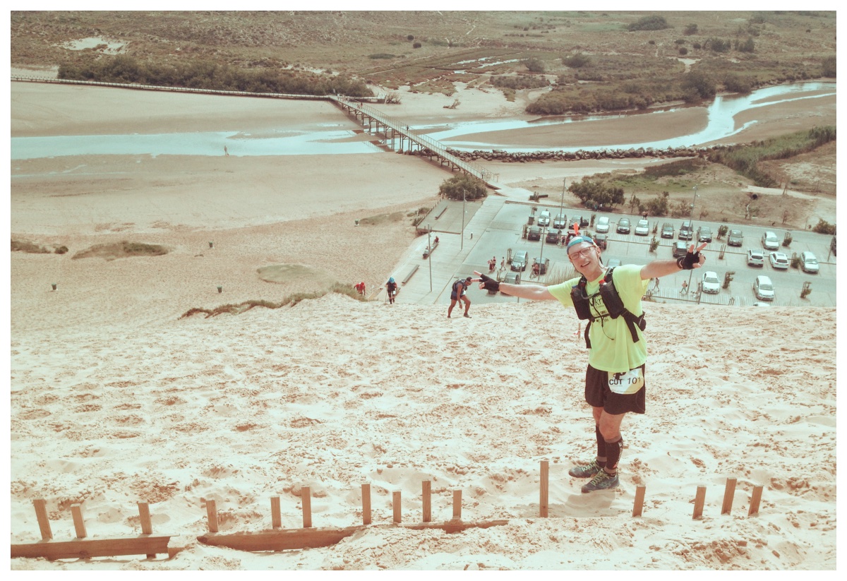 Depois de reabastecer de água, e comer fruta, veio a duna. Logo virando à esquerda, após o abastecimento, tivemos de subir “a duna”. Fui à frente, o Paulo a meio e o Joel no fim, lá em cima areia até descer de novo a duna, por outro lado. Um de nós, “morreu” logo na subida, e na corrida pela areia. Esse elemento da nossa “equipa ad-hoc” só tinha corrido uma vez na areia, e foi na praia em Carcavelos a jogar raquetes, correr ali, foi bem mais complicado.
