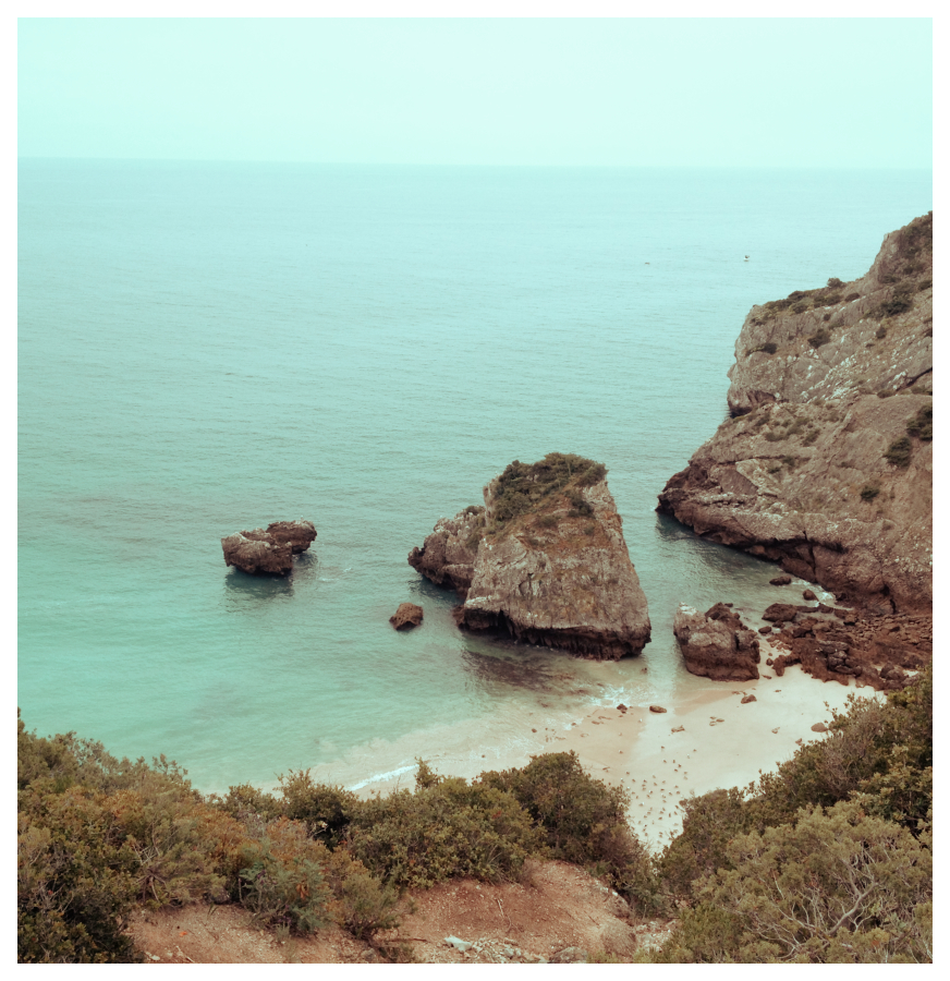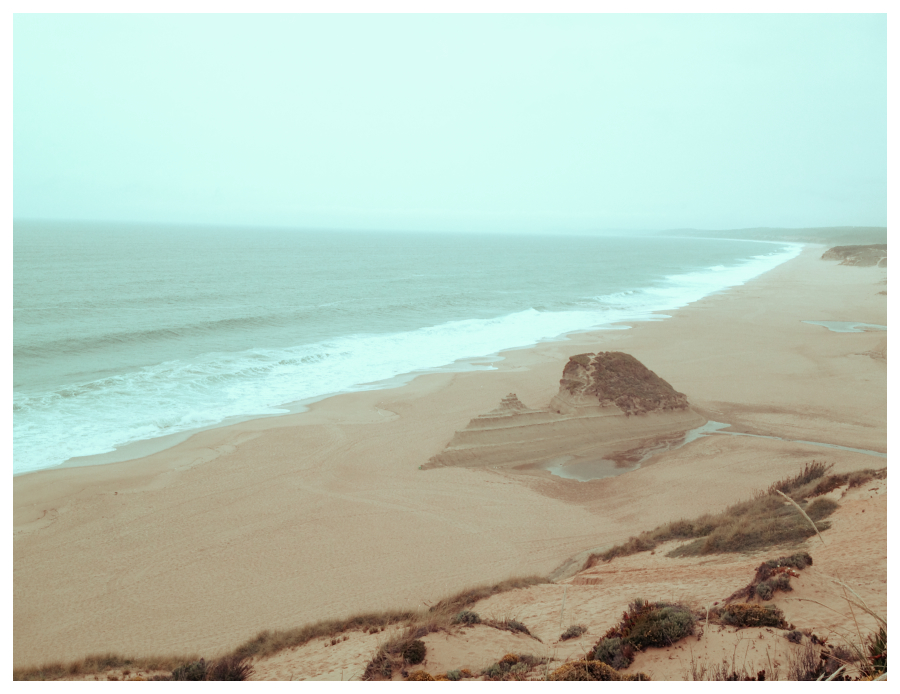 A vista e o local, fantásticos. A vegetação rasteira fazia-me pensar que, se estivesse sol iria ser um autêntico braseiro, e o mar que batia na rocha gerava um efeito épico que me fazia lembrar os livros de “Os Cinco”. Passagem pelo Cabo Espichel e começa a areia, já com o Meco à vista. Os sapatos, decidem reformar-se de vez e, o rasgão enorme na cobertura do esquerdo faz com que, cada passo na areia encha o dito cujo da mesma, nada confortável mesmo.
