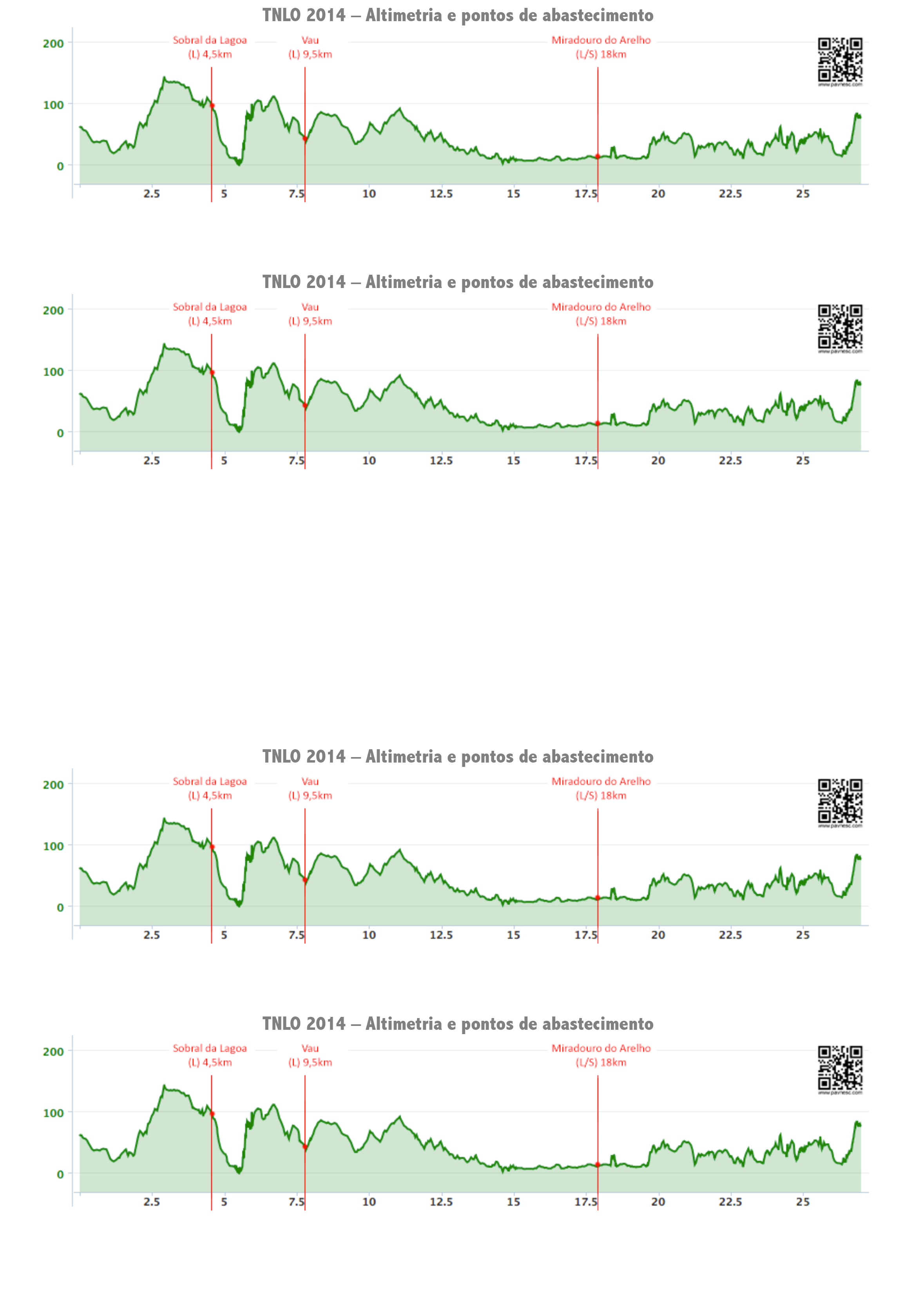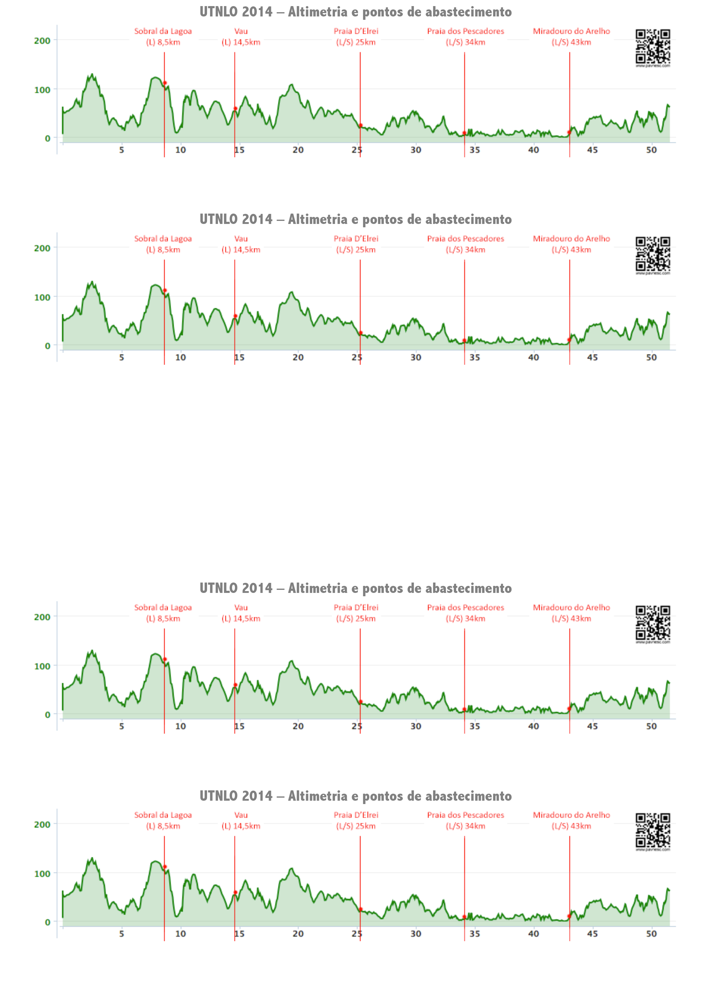 Segundo a última informação disponibilizada pela organização no website oficial da prova, que se realiza no próximo Sábado, em Óbidos, deixo-vos aqui os gráficos das altimetrias, com os pontos de abastecimento e o seu tipo (líquidos ou líquidos e sólidos) assinalados.